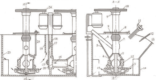 1、主轴;2、叶轮;3、盖板;4、连接管;5、砂孔闸门丝杆;6、进气管;7、空气管;8、座板;9 、轴承;10、皮带轮;11、溢流闸门手轮及丝杆:12、刮板;13、泡沫溢流唇;14、槽体;15、放砂闸门;16、给矿管(吸浆管);17、 溢流堰;18、溢流闸门;19、闸门壳(中间室外壁);20、砂孔;21、砂孔闸门;22、中矿返回孔;23、直流槽前溢流堰;24、电机及皮带轮;25、循环孔调节杆。