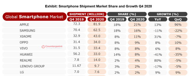 (Counterpoint 给出的 2020 年第四季度全球手机销量数据)