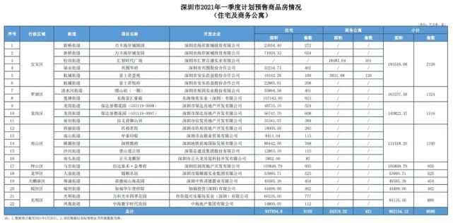 公示显示,截至2021年1月26日,深圳市2021年一季度计划入市的商品住宅及商务公寓项目22个,预计供应房源面积为96.22万平方米,共9586套。其中:商品住宅93.78万平方米,9165套;商务公寓2.43万平方米。