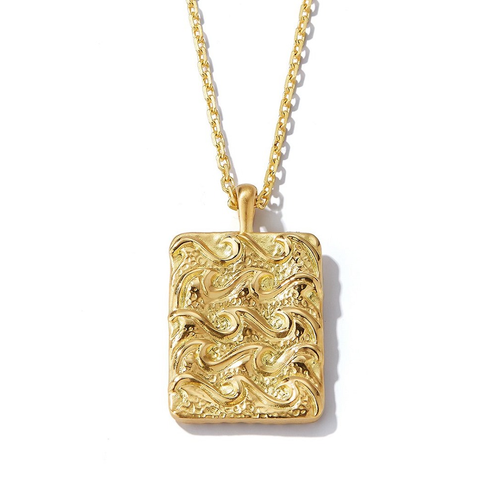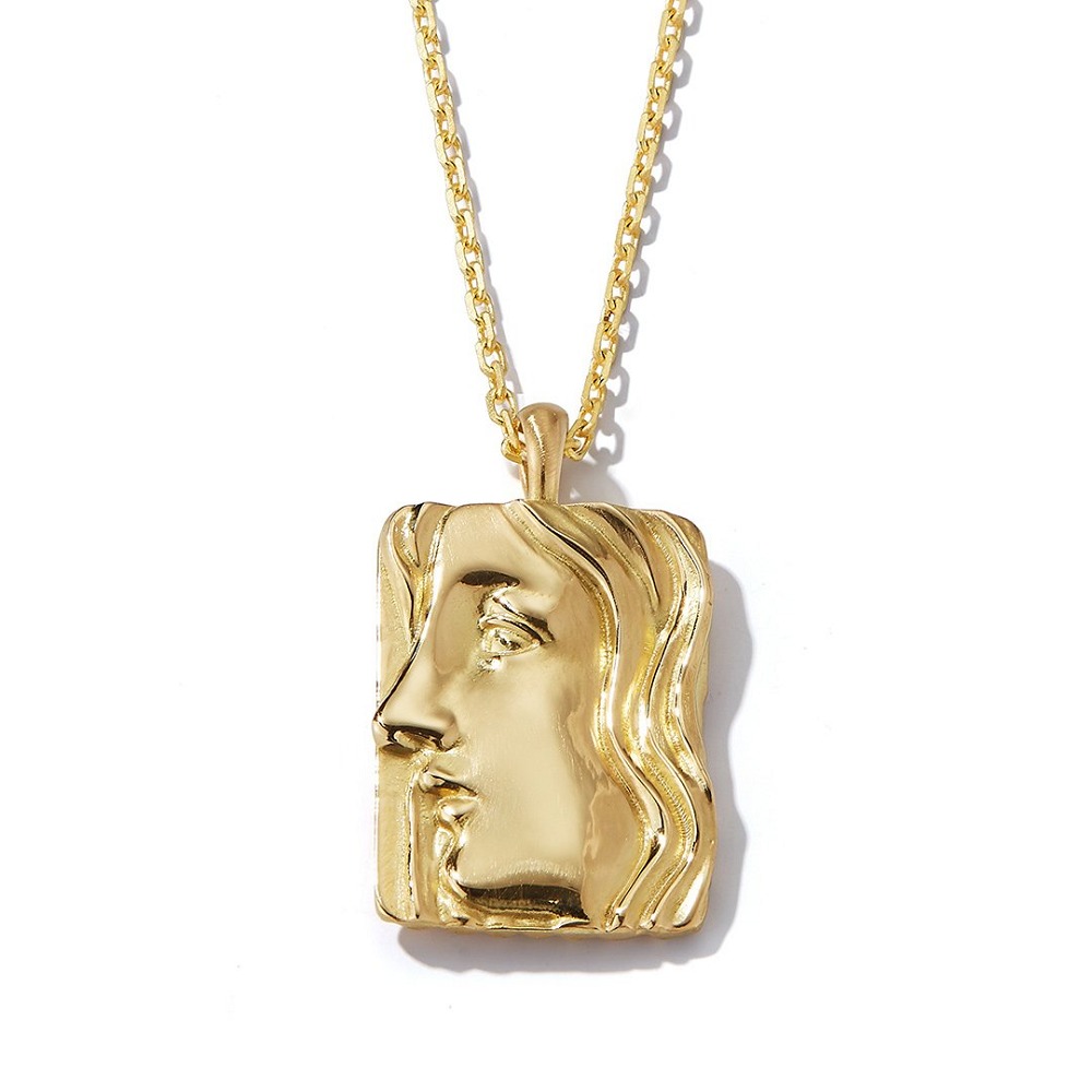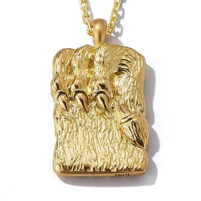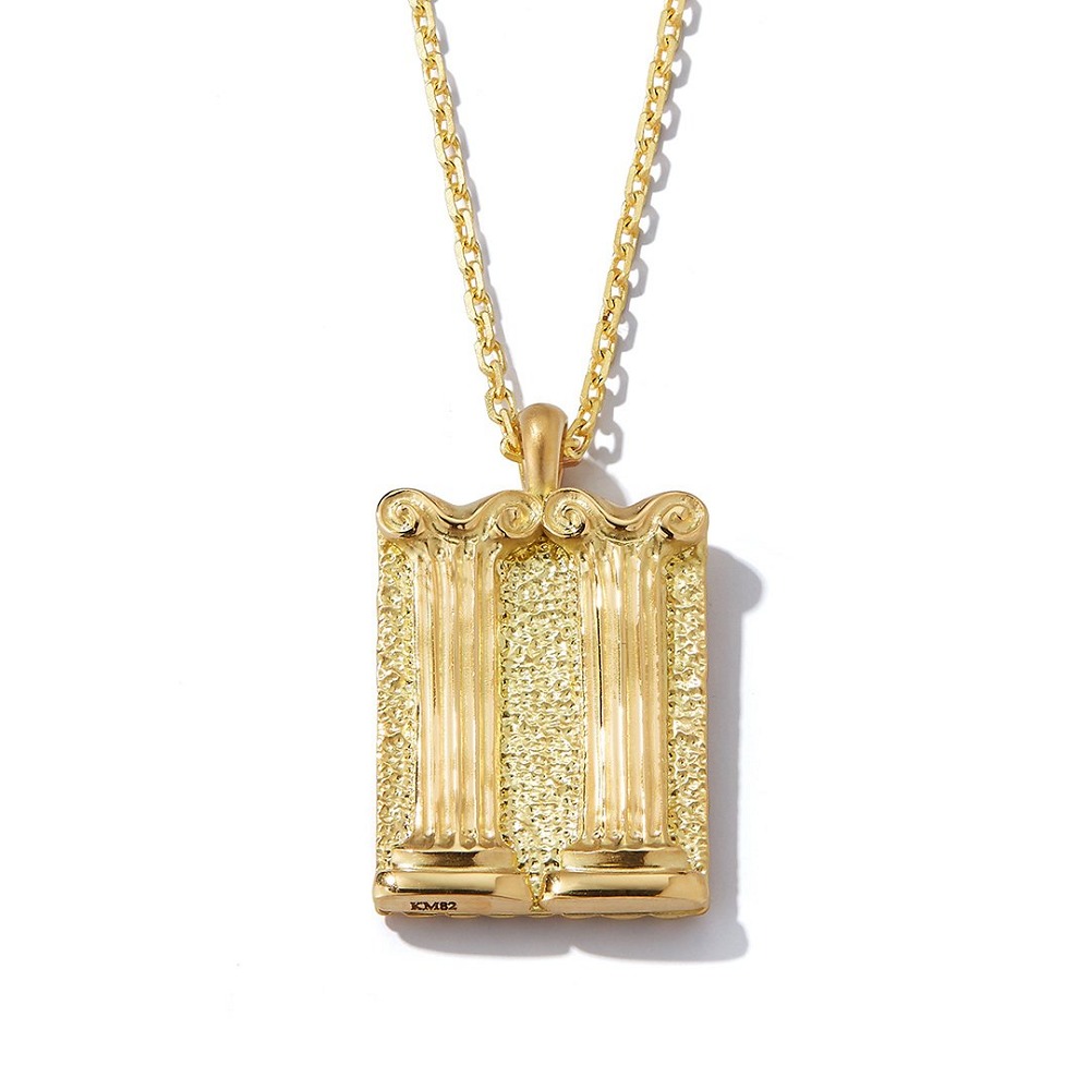 新作品的设计灵感来自1960年代的带扣设计。珠宝商使用黄金制作了一个方形吊坠,其边缘带有圆角。整个吊坠融合了钻石镶嵌,金雕和锤打金工艺,充满精致的细节,让人联想到原始的雕刻石板。