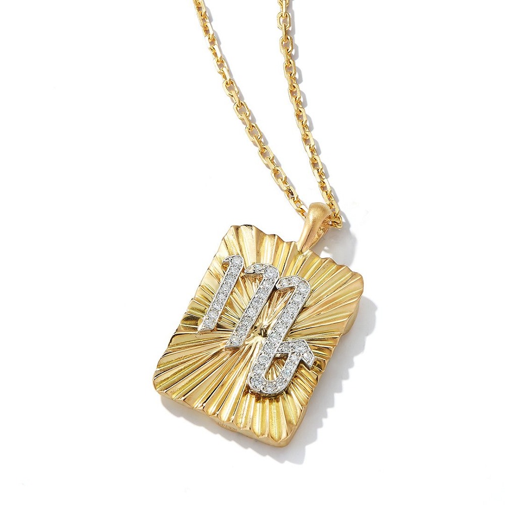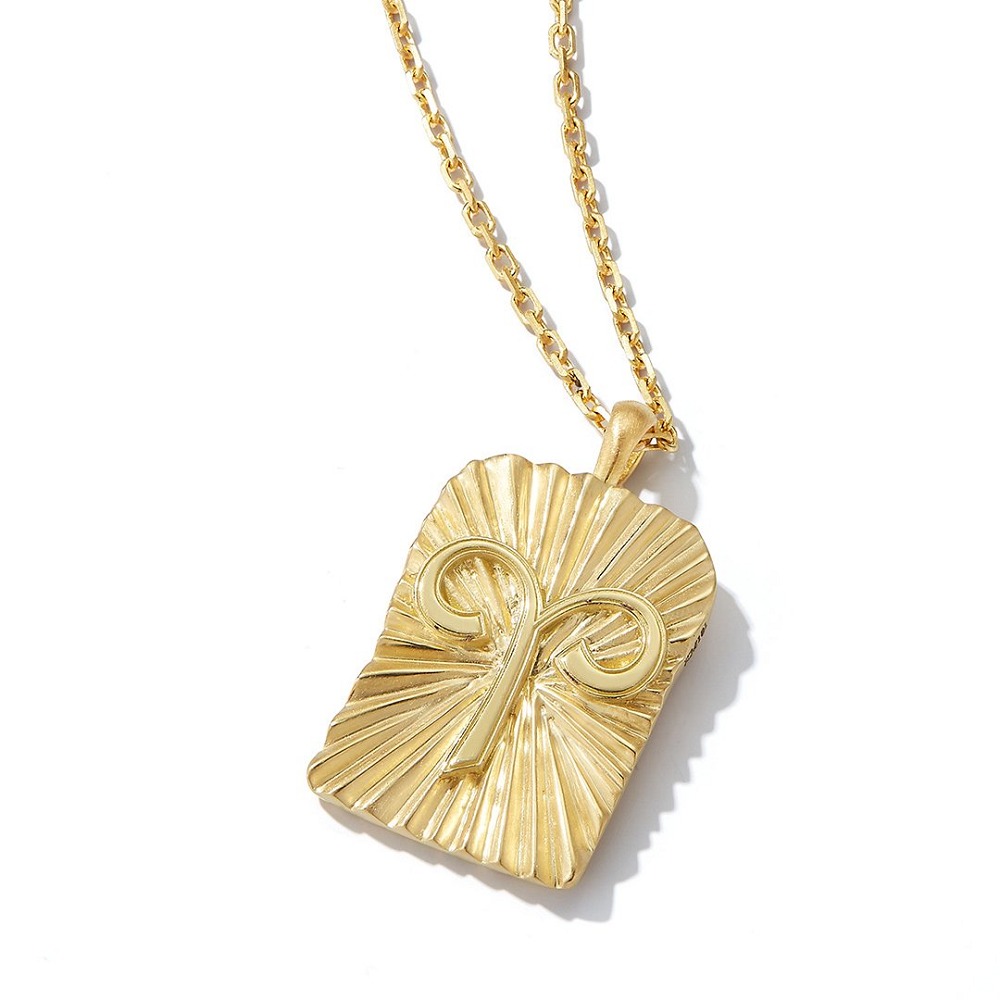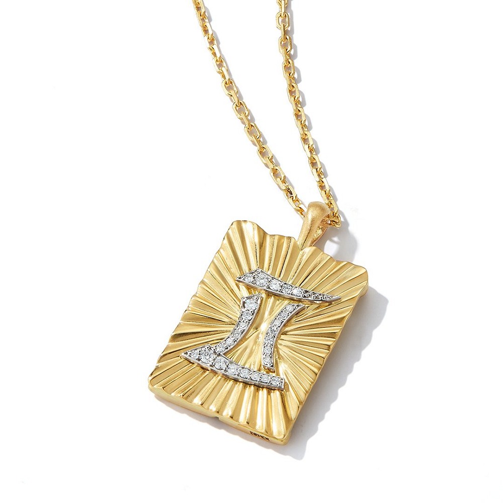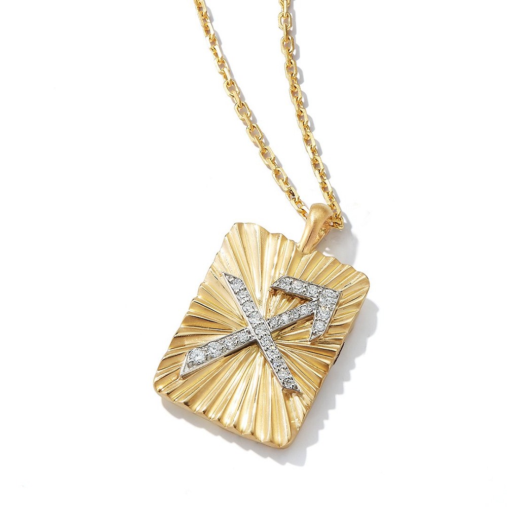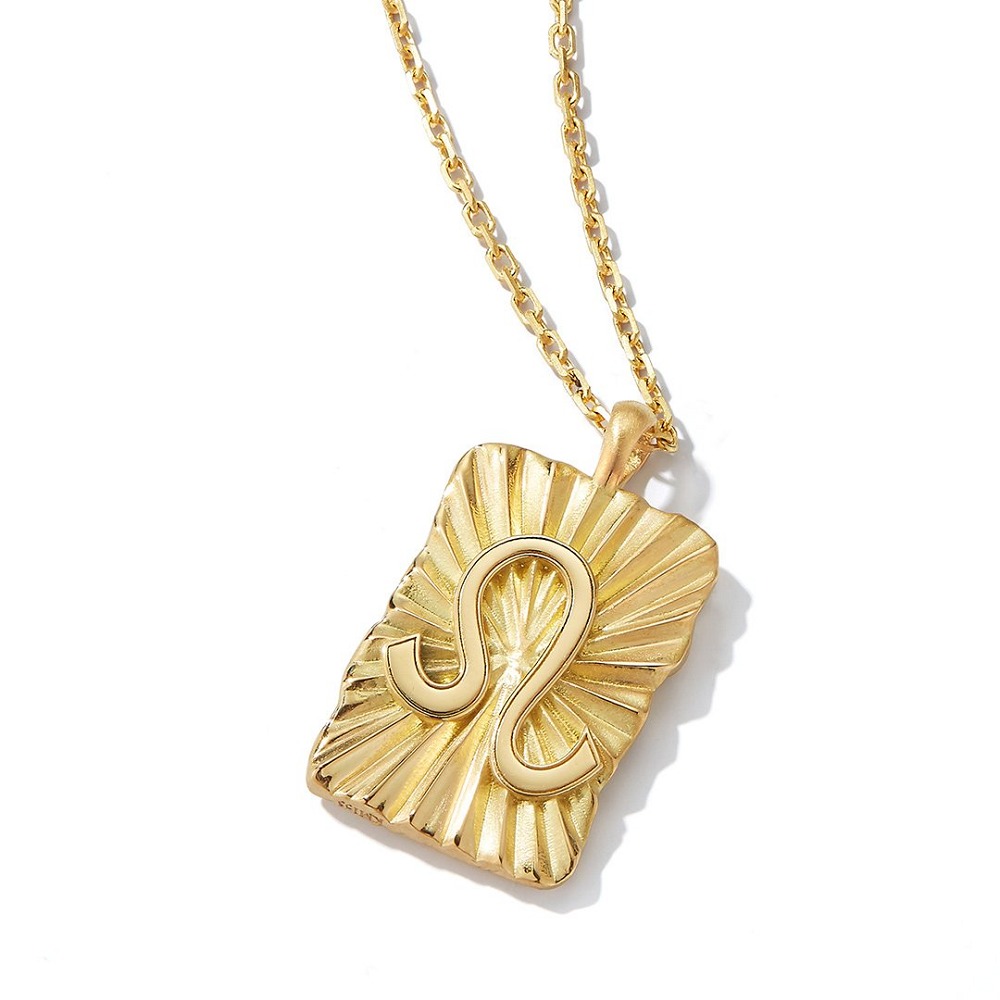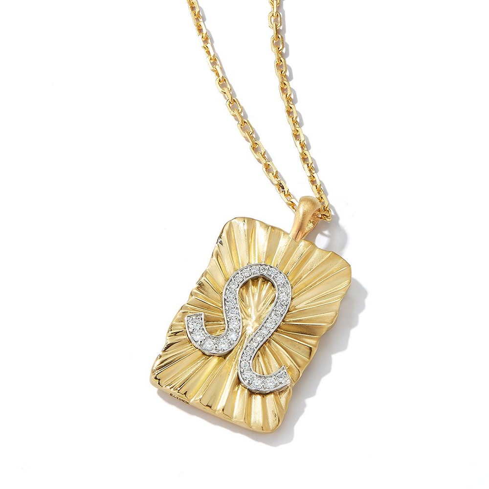 新吊坠的一侧采用抽象风格-星座符号通过钻石勾勒出轮廓,展现出耀眼的光芒和火光;金基板设计为放射状的三维雕刻形状,具有出色的光影效果。