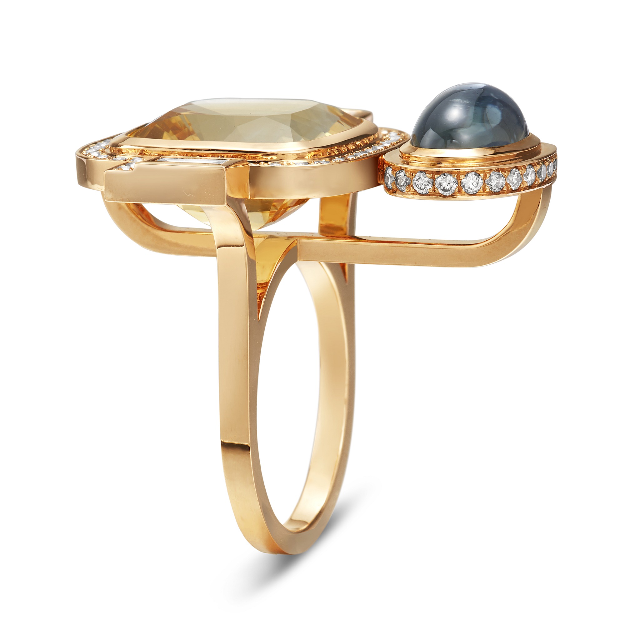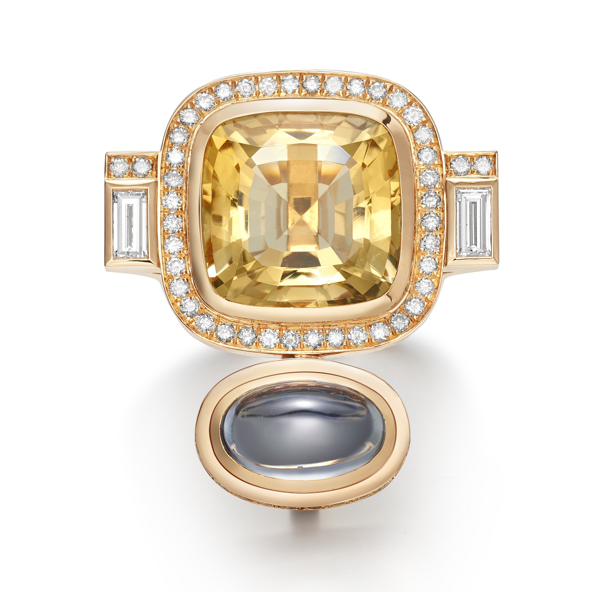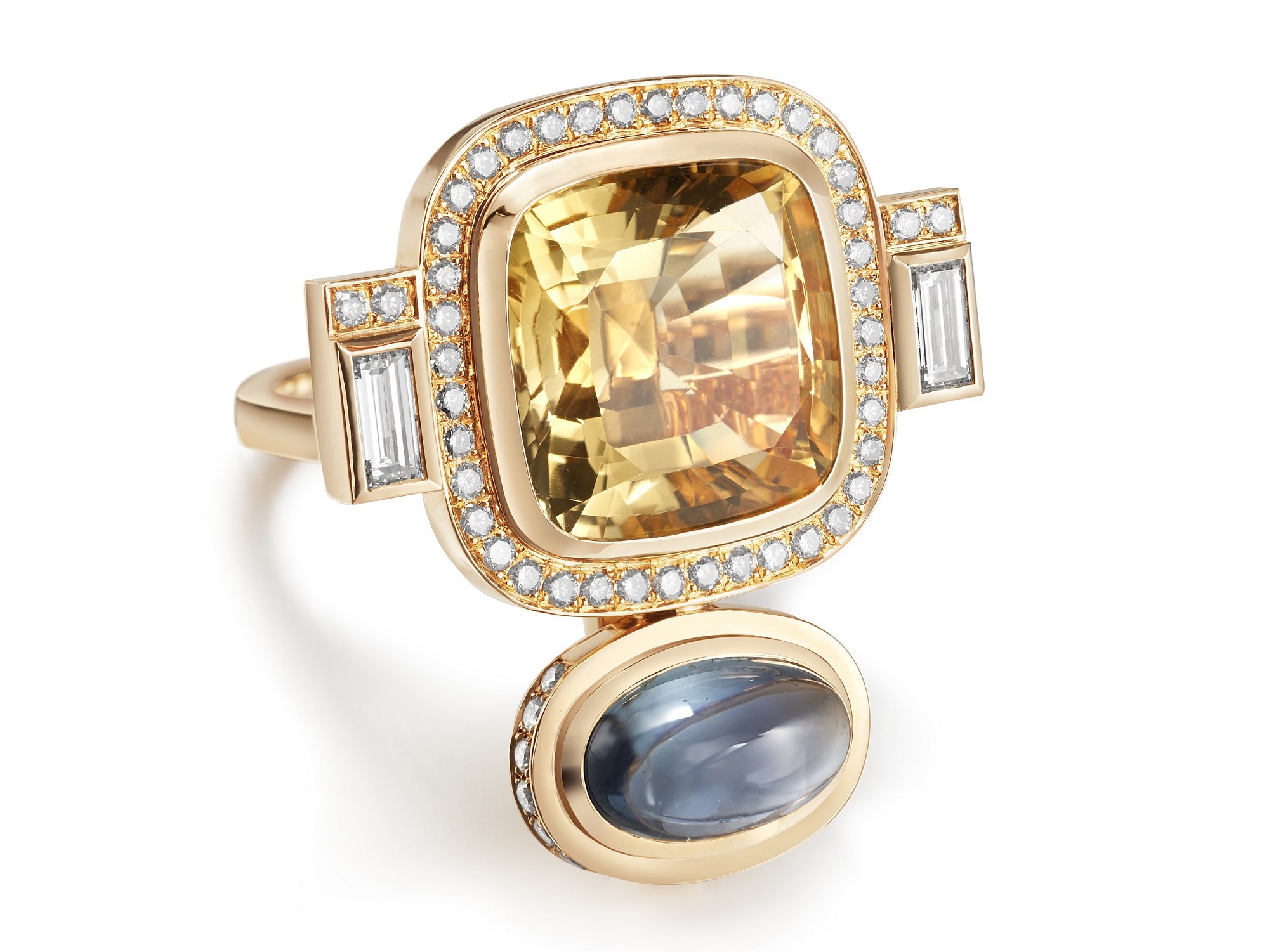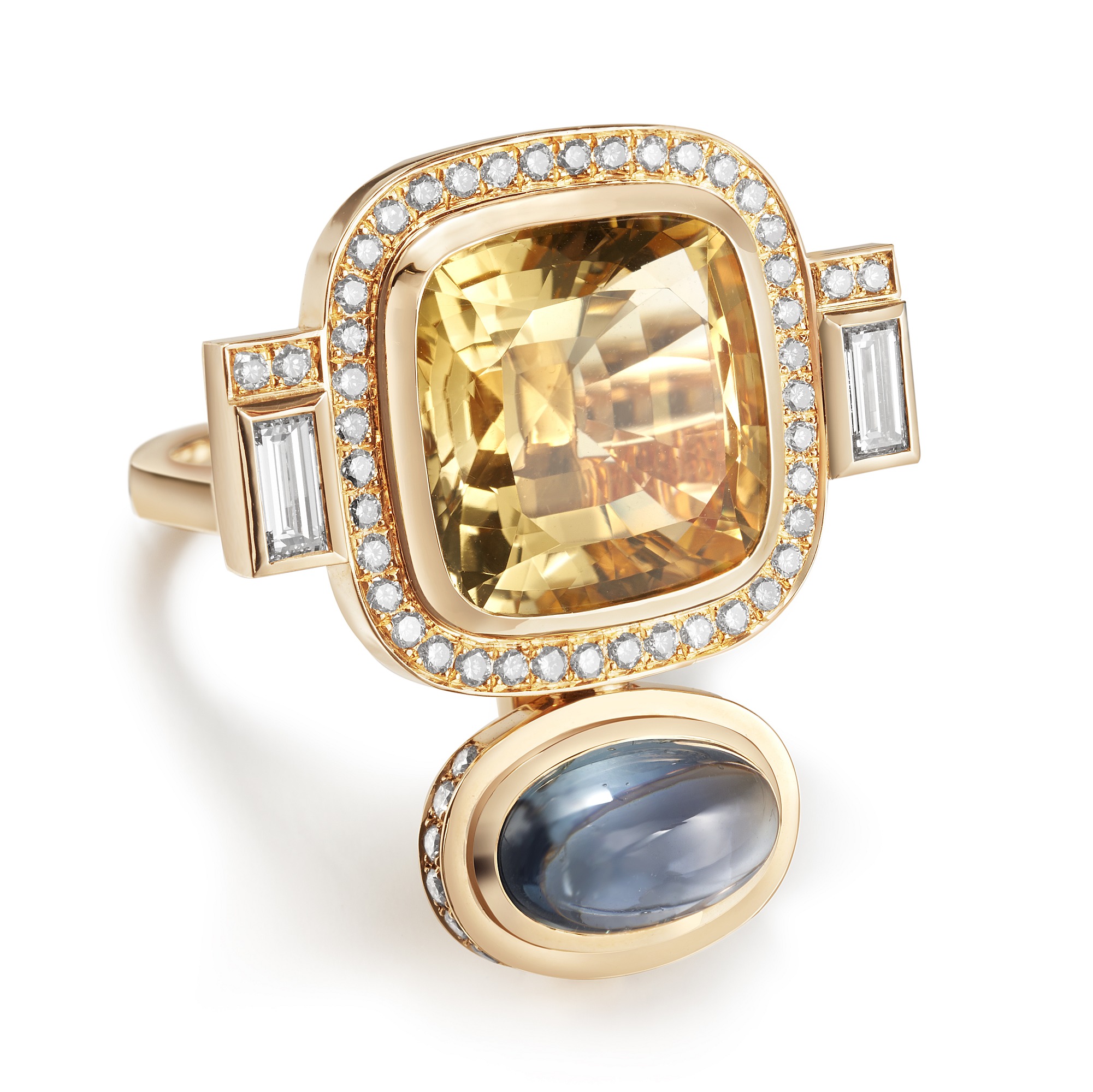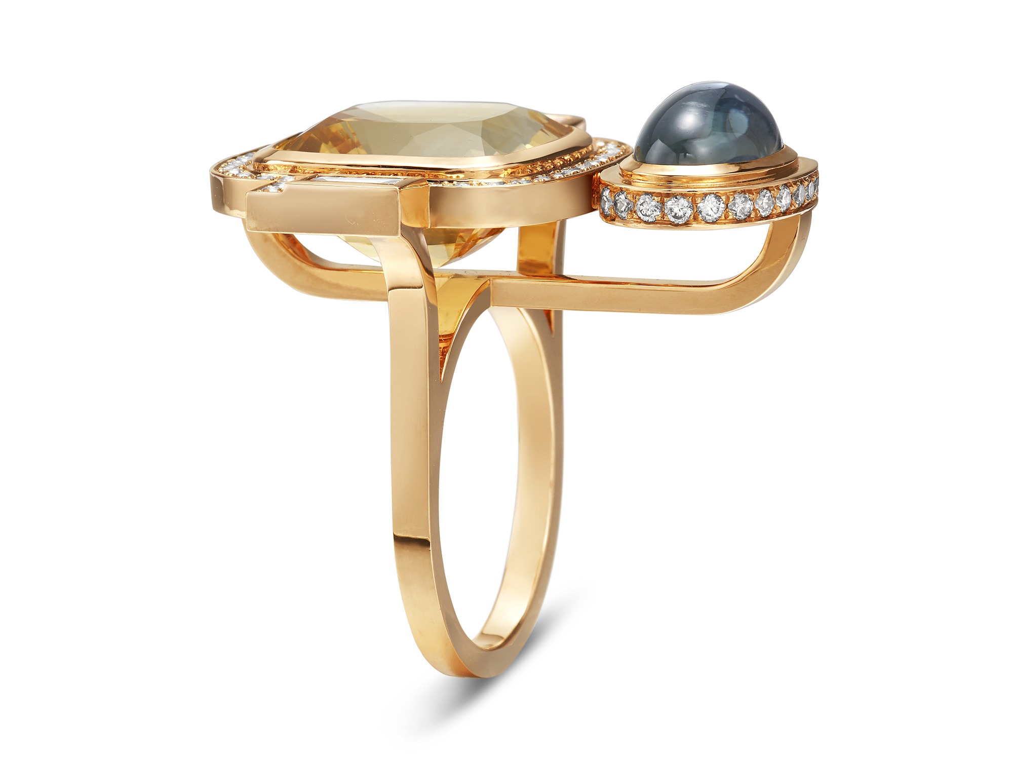 Àl'écoute戒指采用独特的双宝石设计-戒指表面中央是垫形切割的黄水晶,具有明亮的金色调。表圈结构强调了宝石的几何形状。主石两侧镶嵌有2个长石。阶梯形钻石使环壁结构巧妙地隐藏;弧形切割的蓝宝石从主宝石的侧面延伸出,呈现朦胧而柔和的色调,镶托侧面边缘的圆形钻石成为画龙点睛的一笔。