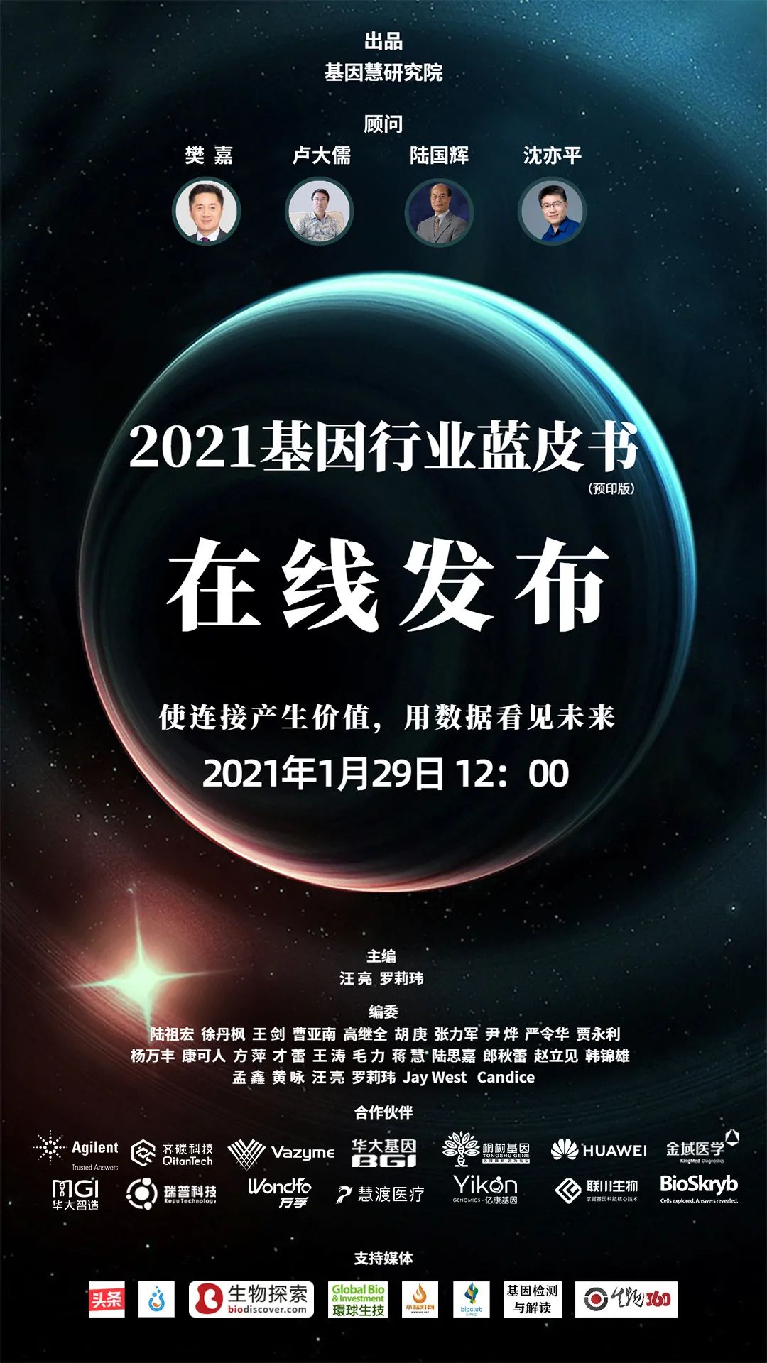 自2017年起,基因慧研究院连续推出年度基因行业研究报告,旨在推动基因科技的普及、转化及创新创业。2021年1月29日,由樊嘉院士、沈亦平教授、卢大儒院长、陆国辉教授等专家作序推荐,基因慧联合14家机构共同推出《2021基因行业蓝皮书(预印版)》电子版,面向公众开放免费申请通道(申请方式见文末)。