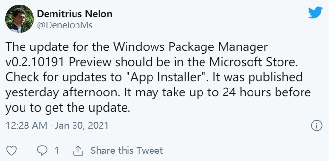该功能已由构建包管理器的团队成员 Demitrius Nelon 在推特上进行了展示,并于昨日作为 App Installer 软件包的一部分提交到了微软应用商店,现已可下载更新。