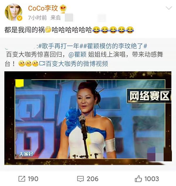 瞿颖对李玟的模仿也引起了李玟本人的注意,李玟对此还幽默回应称:“都是我闯的祸”,言语之间透露着情商之高。