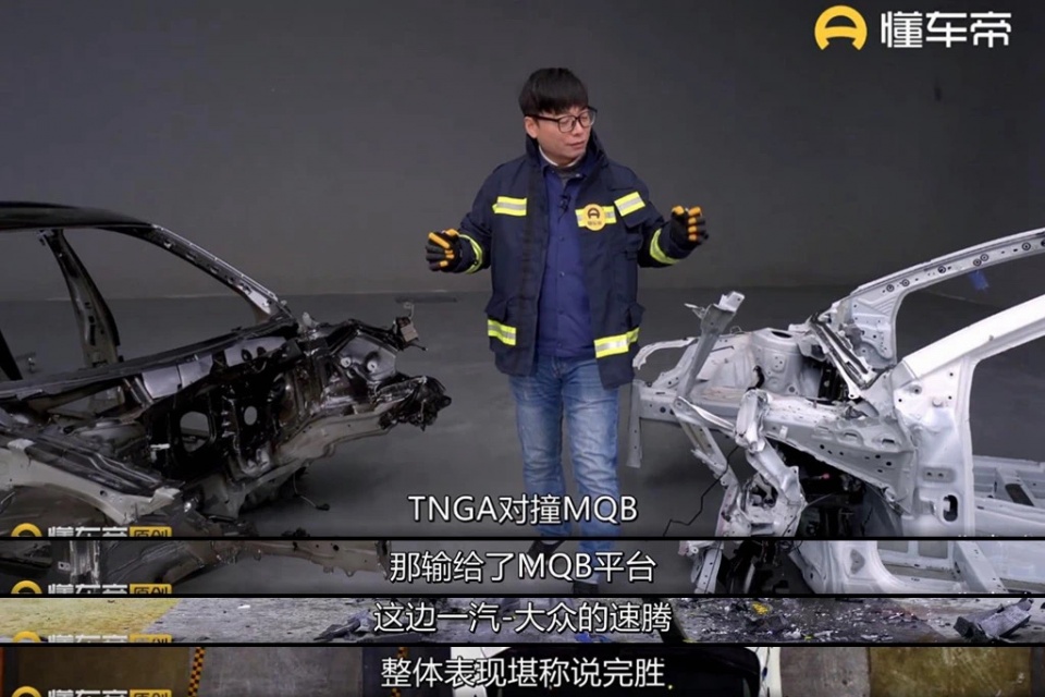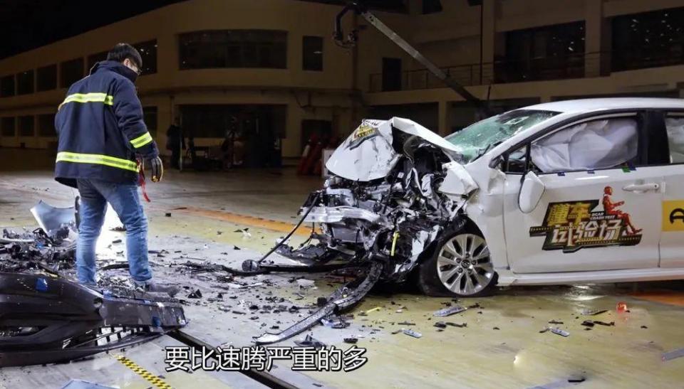 要知道,在时速超过100公里/小时的情况下发生碰撞,车辆基本上也就报废了。而这一次试驾中128公里/小时的相对速度之下,主办方竟然还在评价哪辆车受损程度更高。在长达14分钟的视频中,主持人一系列迷之分析之后,得出了速腾“完胜”的结论。他给出的理由是,在碰撞后,丰田卡罗拉车身溃缩程度较为严重,入侵量长于大众速腾,且卡罗拉驾驶员侧A柱下部呈外八字明显弯折,车身有多处变形,车门铰链柱出现明显缝隙,轮毂部分有侵入驾驶舱的危险。