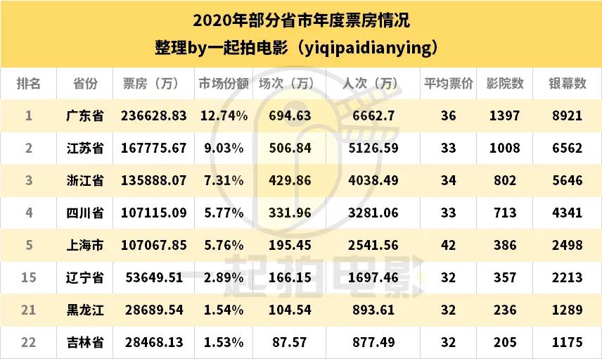仅以2020年全国各省市的票房产出数据为例:黑龙江、吉林、辽宁三省份所占的市场份额总和仅为5.96%,加在一起才勉强超过全国第四的四川省,市场份额5.77%。而东三省当中,最好的辽宁省,全国排名也仅为全国第15。