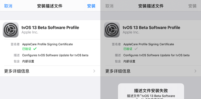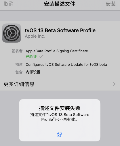 所以你现在安装 tvOS 13 它会出现安装失败提示。
