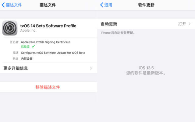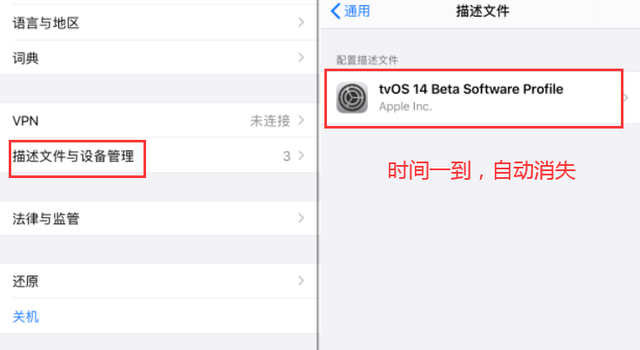 而之前已经安装 tvOS 13 的设备,设置-通用-描述文件的 tvOS 13 会自动消失,并且屏蔽也会失效,如果你不注意,设备就会出现自动升级了。