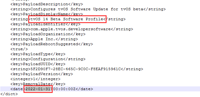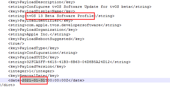 上述内容大概了解后,接下来说正题了,今天 tvOS 13 屏蔽系统描述文件过期了,有效期至2020年1月31日,也就是今天了。
