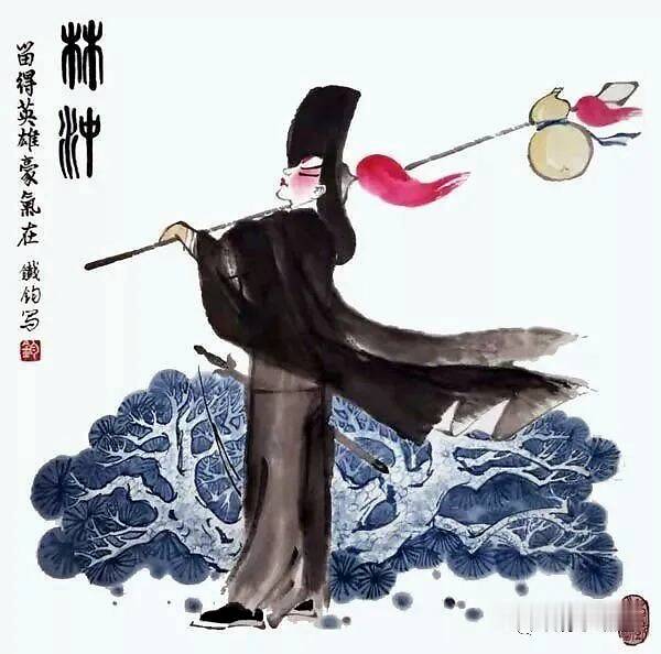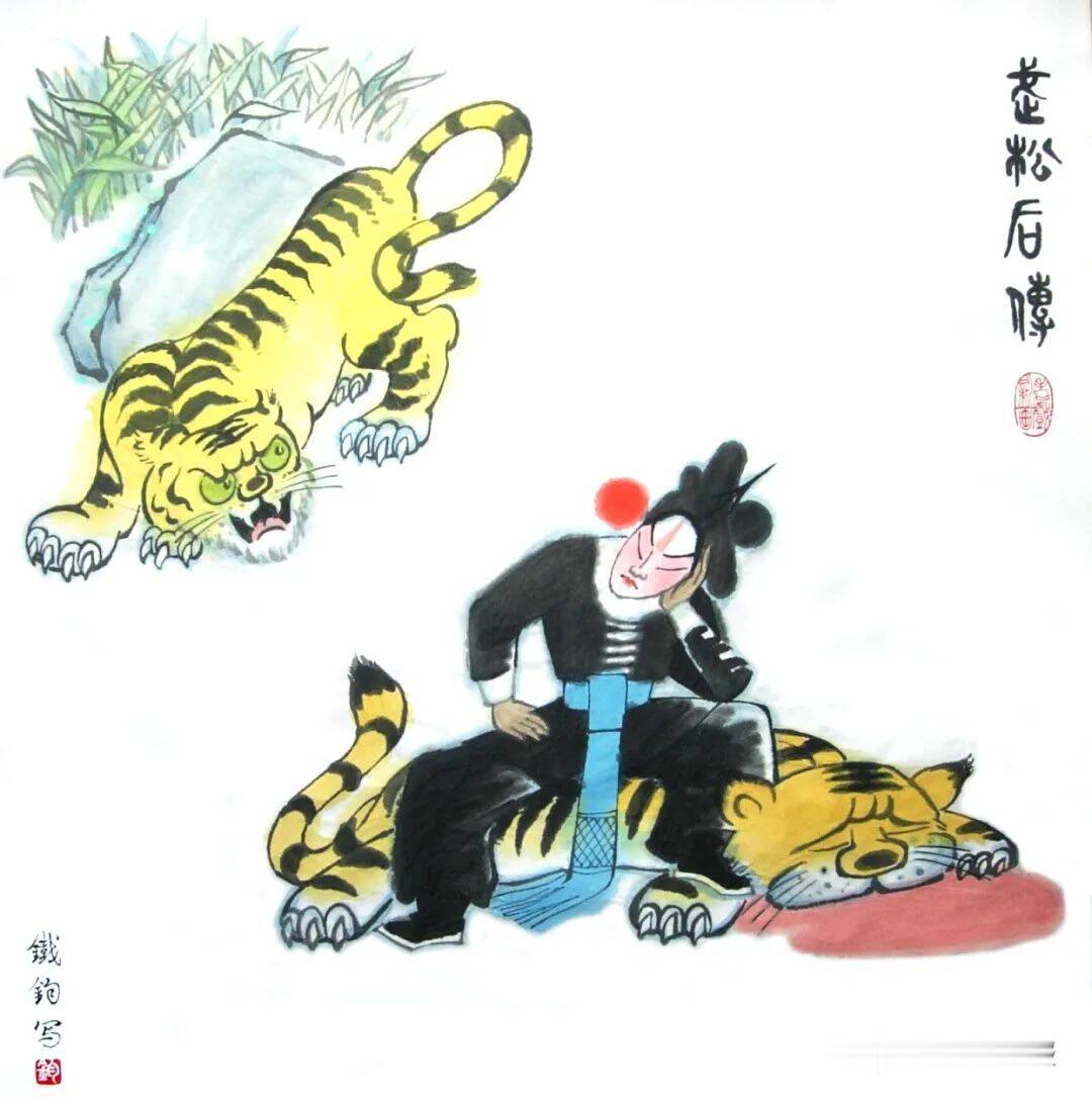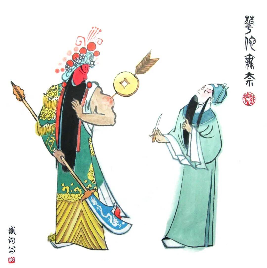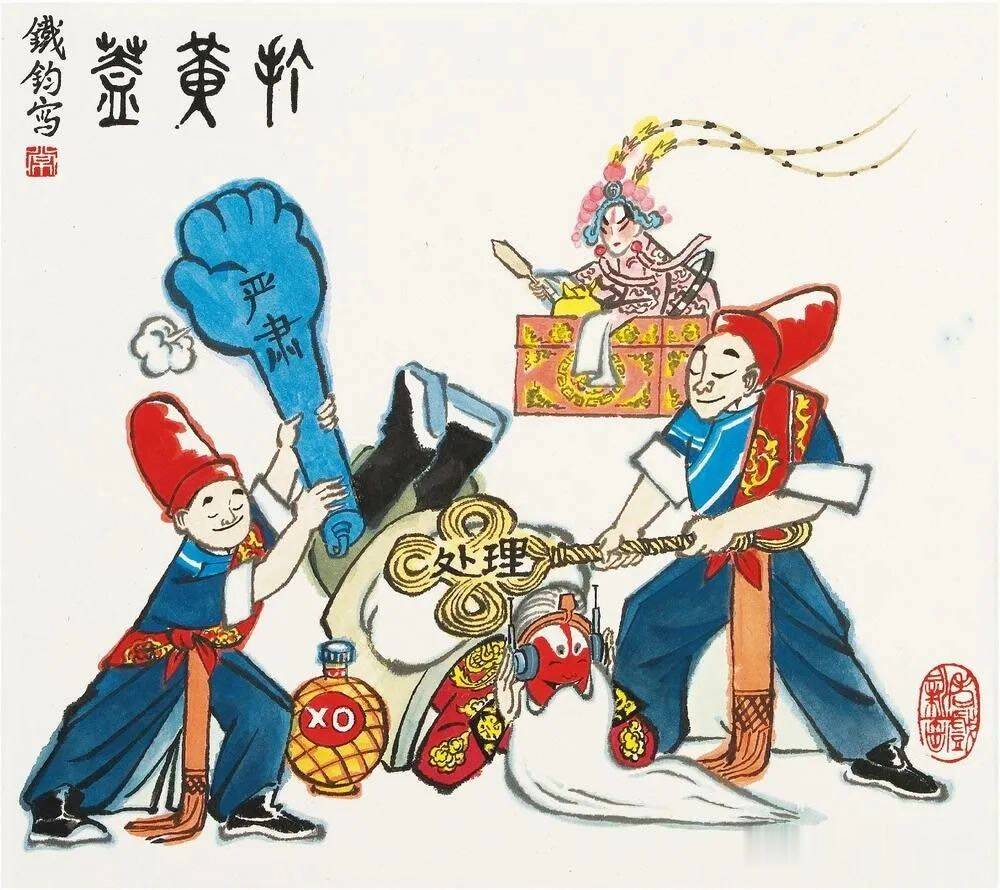常铁钧从上个世纪八十年代中期开始“老戏新画”的创作尝试,与一般“戏画”既有联系又有区别,其联系在于,“老戏新画”与“戏画”里都会出现传统戏曲(主要是京剧)中的人物或情节;其区别在于,“戏画”只是以戏曲人物或情节作为描写对象,而“老戏新画”则是借戏曲人物或情节作为漫画构思的一种因素或手段,更重要的是它必须具有漫画明确的现实针对性,具有漫画所特有的奇巧性、评议性和幽默感。