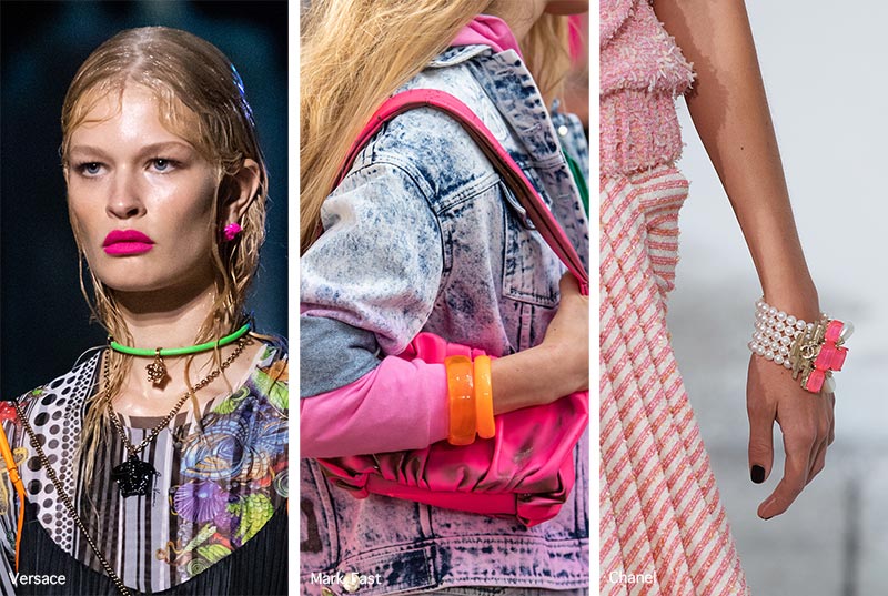 范思哲(Versace)用充满活力的霓虹色颈链和电绿色和粉色耳环主宰了霓虹游戏。设计师马克·法斯特(Mark Fast)选择了亮色搭配亮色,他的系列中充满了霓虹色休闲装,搭配同样吸引眼球的多种霓虹色手镯和耳环。