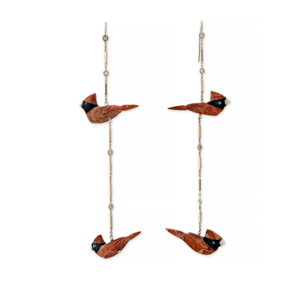 同样引人注目的是一组半宝石吊坠,它们以简洁的线条勾勒出“雷鸟”图腾的轮廓。吊坠的中央镶嵌有绿松石,红碧玉,月光石,on玛瑙和其他宝石切片,与“雷鸟”图像的原始颜色相符。翅膀和尾巴的羽毛可以看到细长的雕刻。吊坠的外圈镶有钻石,风格简洁明快。