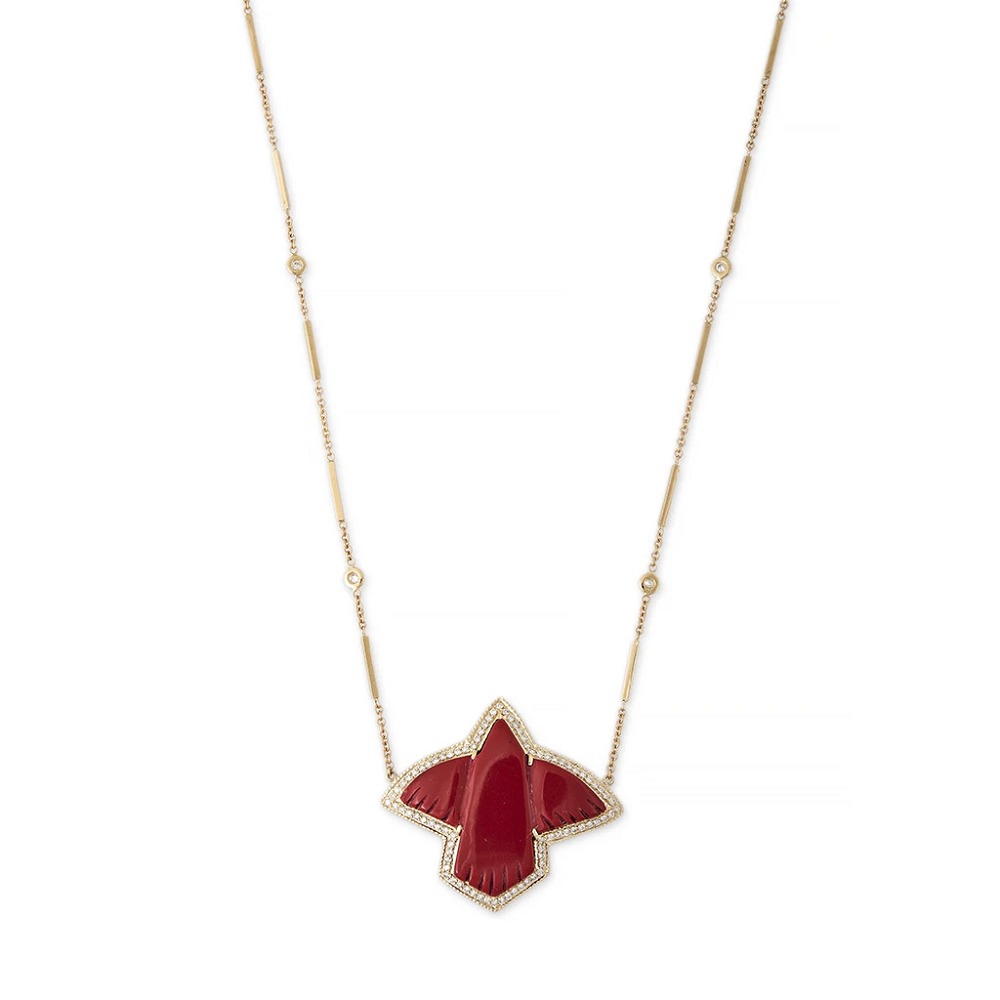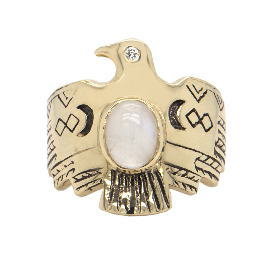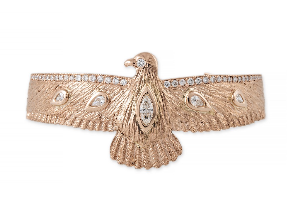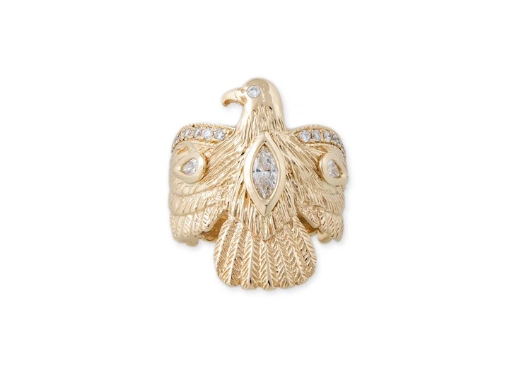“雷鸟”(Thunderbird)是美洲原住民传说中的巨大神鸟。它看起来像老鹰,并具有打雷和闪电的能力。拍打翅膀时会引起雷声;眨眼的眼睛释放出闪电。雅克·艾奇(Jacquie Aiche)将这种神话般的形象融入到珠宝设计中,象征着坚定不移的力量并像护身符一样带来庇护。