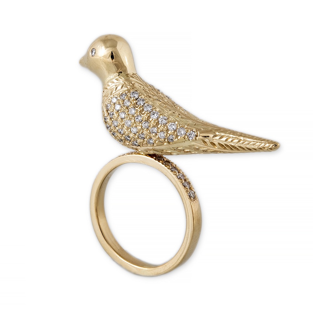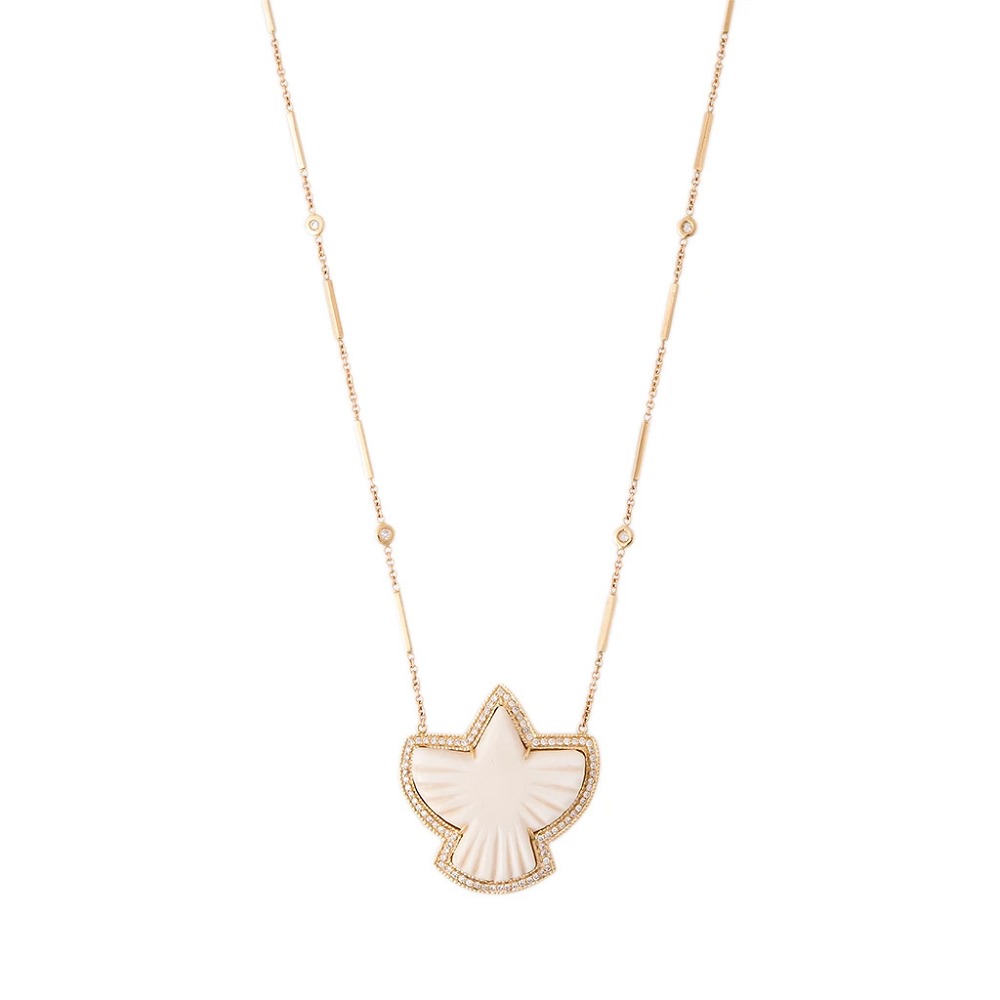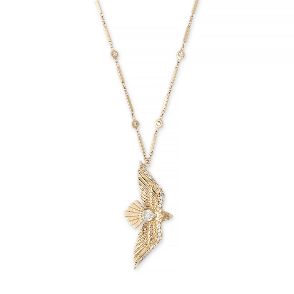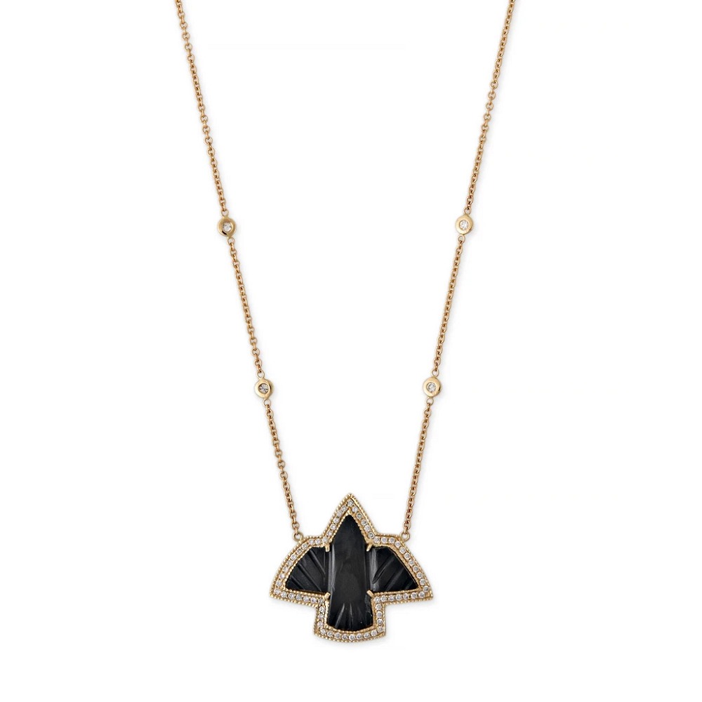 “雷鸟”(Thunderbird)是美洲原住民传说中的巨大神鸟。它看起来像老鹰,并具有打雷和闪电的能力。拍打翅膀时会引起雷声;眨眼的眼睛释放出闪电。雅克·艾奇(Jacquie Aiche)将这种神话般的形象融入到珠宝设计中,象征着坚定不移的力量并像护身符一样带来庇护。