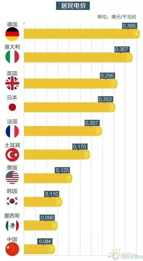 目前,中国的居民电价为0.084美元/千瓦时,低到几乎是德国电价0.395美元/千瓦时的五分之一!