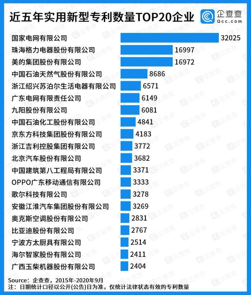 近五年发明专利企业TOP20里,国家电网比华为还要高出3552项。