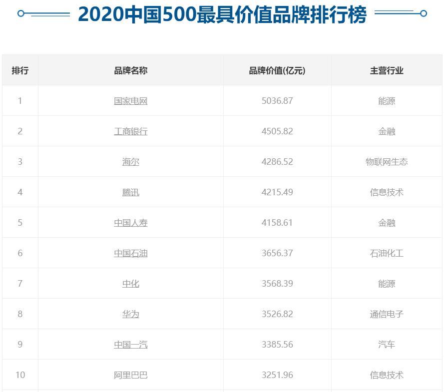 《2020中国500最具价值品牌排行榜》上,国家电网高居第一,品牌价值达到了5036.87亿元,这是它连续第五年夺冠了。