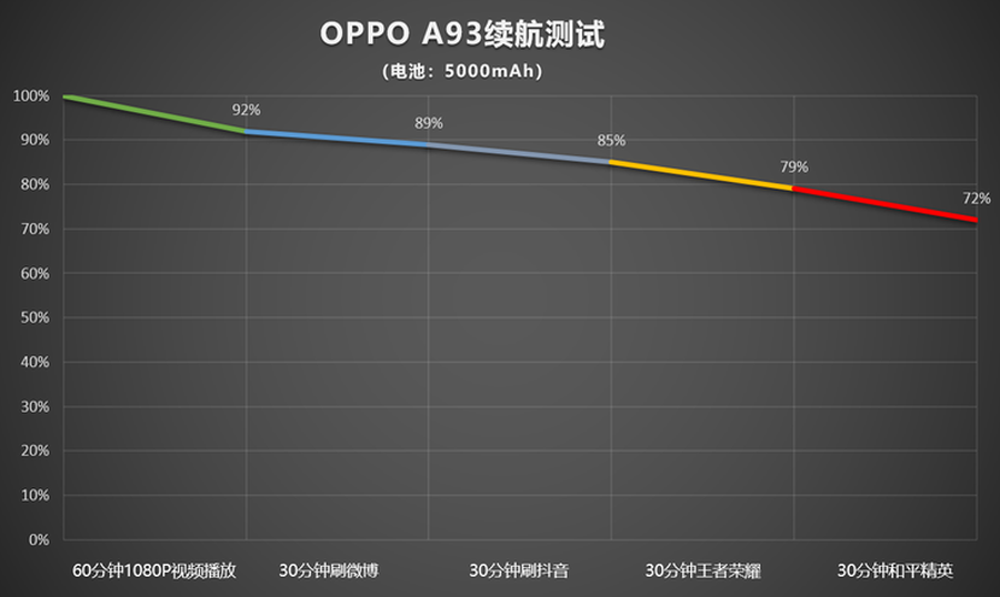 续航是这款手机的重要亮点之一,OPPO A93内置5000mAh大容量电池,支持18W充电。在经过3个小时的重度续航测试后,OPPO A93剩余电量还有72%,这样的续航成绩十分出色,而且还是在90Hz高刷新率模式下测试的。长续航表现可以让用户日常使用更加放心,不用时刻惦记着充电。