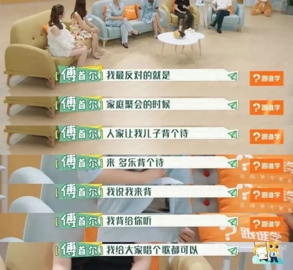 不等孩子犹豫,傅首尔就立刻为儿子解围:“我来背,我给大家唱首歌都可以。”