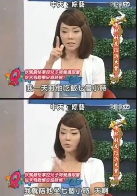 为了他能有一个强壮的体魄,她会每天准备好饭菜,盯着孩子吃完。孩子吃七个小时,她就陪七个小时。