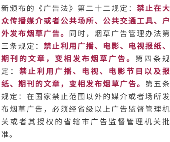 “其实严格来说国内是没有把电子烟纳入烟草统一管理的。因此之前广告法中对烟草广告的管理并不适用于电子烟。但是此前国家曾经发布过禁止电子烟互联网营销的通知,所以肯定不能出现明显的电子烟镜头。走这种招牌广告露出,算是打擦边球的一种吧,但还是有风险。”某平台剧集植入相关负责人告诉娱子酱。