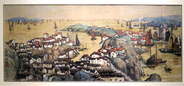 借国画线描手法,用水彩点染出渔村船港,是别一种美。
