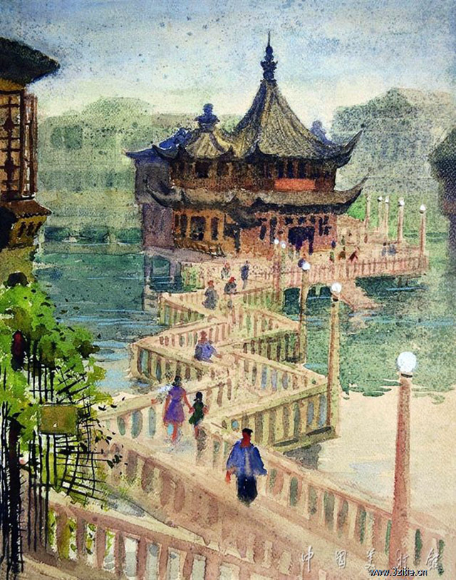 这幅《上海九曲桥》是哈定先生以鸟瞰的视角表现了九曲桥的屈曲折转,通过远逝的桥身把观众的视线再次引向远处的亭台水榭。哈定先生充分发挥了水彩画透明的特点,同时把糨糊和水彩颜料加以混合使用,使建筑物和湖水造成了愈到远处愈斑驳陆离的效果,与前景中清雅明静的湖水相呼应,使整个画面生动而充满情趣。