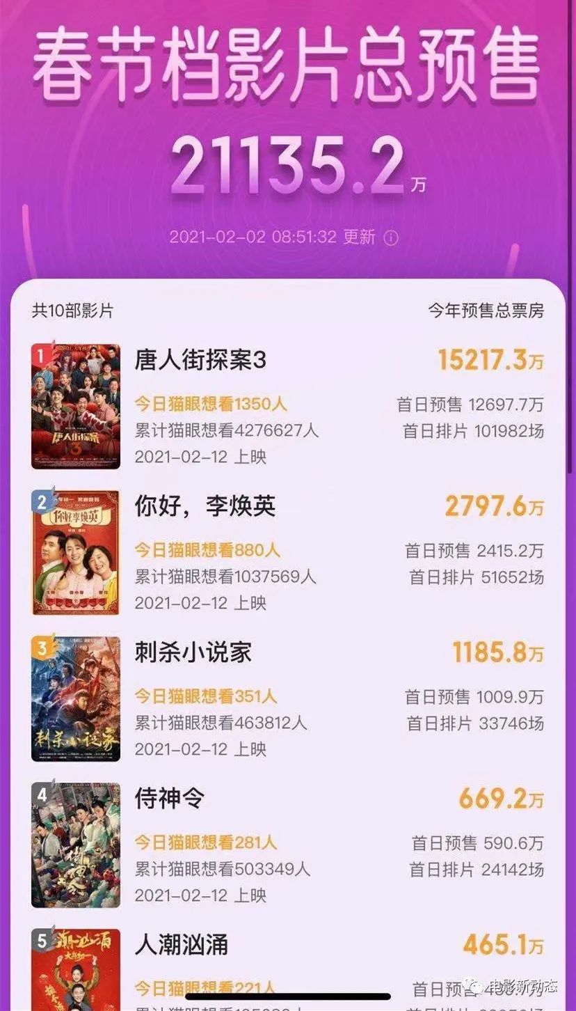 【附】据电影票房数据分析平台猫眼专业版显示,截至2月2日上午8时50分,春节档电影预售总票房已达2.11亿元,其中《唐人街探案3》以1.52亿元位列榜首,占2021年春节档总预售的72%左右。预售票房位列第二第三的的分别是《你好,李焕英》和《刺杀小说家》。随着倒计时临近,会加强这种头部效应还是出现其他影片的数据反超呢?
