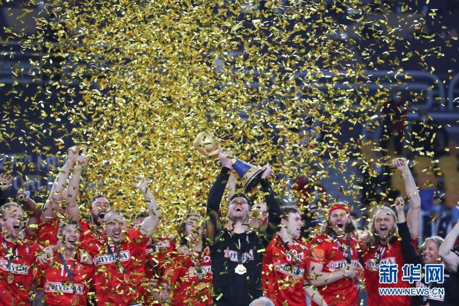 1月31日,丹麦队球员在颁奖仪式后庆祝。 当日,在埃及开罗举行的世界男子手球锦标赛决赛中,丹麦队以26比24战胜瑞典队,获得冠军。 新华社发