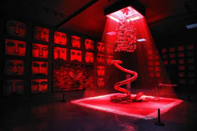 “若望”拉丁文意为“慈爱者”,若望“抗疫”就是艺术家刘若望以悲悯之心表达 “天下无疫”的愿景。展览作品涉及到雕塑、装置、油画和多媒体等多种艺术形式,展示空间也涵盖了北京渡渡美术馆室内外展厅和渡渡国际雕塑园。在室内空间展出的人眼、巨蛇、蝙蝠、枯木等挑战舒适感的元素,浓重的色彩和强烈的敏感关系,给观者带来巨大的冲击。而室外雕塑除了早期的“人民”、“天兵”等系列,主要是以动物为主体的作品,如“渡渡鸟”、“原罪”、“狼来了”等等。无论是室内以红色为主色调的作品,还是室外超大体量的作品,都带有艺术家悲天悯人的情怀。人类并不是至高无上,展厅中无数双眼睛在面对这个被疫情扰乱到失控的世界,疫情就像展厅中间的巨蛇,对周围的一切带来压迫感。而雕塑公园的动物无论是哪一种,它们都是与人类共存于宇宙的“苍生”。艺术家在警示我们应该重新思考人与人,人与自然、与生态系统之间的关系。