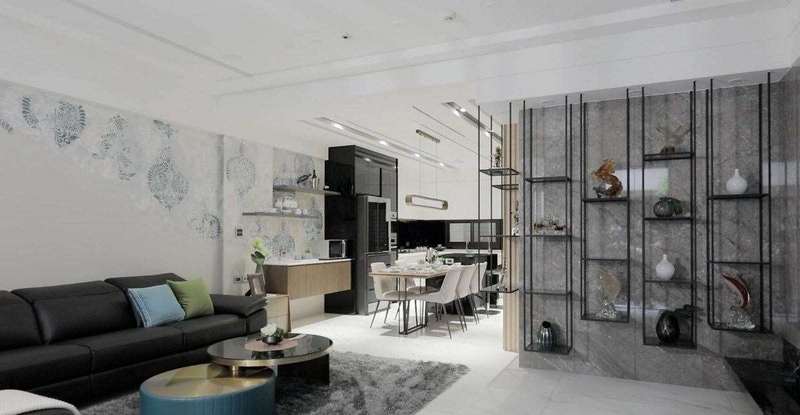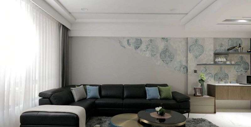 进门处规划整面铁件展示柜,满足屋主摆放琉璃收藏品的需求,也让宾客留下深刻印象;客厅沙发背墙特别以意大利涂料搭配大马士革图腾手作叠加,型塑画作般的艺术端景。