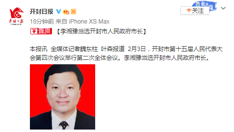 2月3日,开封市第十五届人民代表大会第四次会议举行第二次全体会议。李湘豫当选开封市人民政府市长。