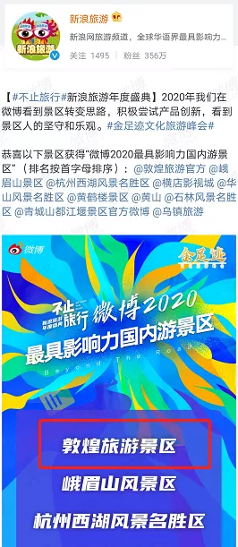 敦煌旅游景区获得“微博2020最具影响力国内游景区”殊荣