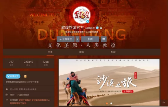 @敦煌旅游官方 微博自开通以来,在敦煌文旅集团的运营下影响力也是逐年攀升,并联合@莫高窟、@鸣沙山月牙泉、@玉门关遗址、@雅丹国家地质公园、@敦煌阳关景区、@敦煌夜市、@敦煌文创等景区官方微博做大做强敦煌旅游矩阵营销,整体宣传敦煌旅游,提升敦煌影响力。