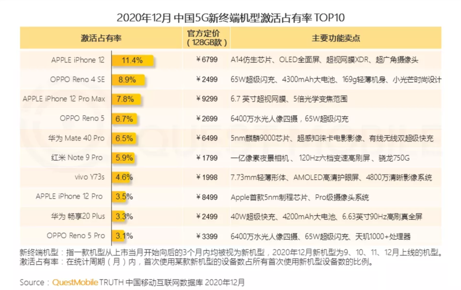 而在持续增长的5G手机市场中,OPPO的表现也同样喜人。根据QuestMobile公布的统计监测数据显示,2020年12月中国5G新终端机型占有率TOP 10中,OPPO Reno4 SE、Reno5、Reno5 Pro分别排在了第二、第四、第十的位置上。