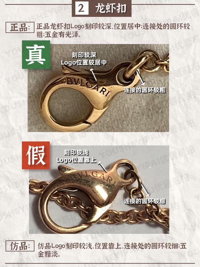 正品龙虾扣Logo刻印较深,位置居中;连接处的圆环较粗;五金有光泽。仿品Logo刻印较浅,位置靠上,连接处的圆环较细;五金黯淡。