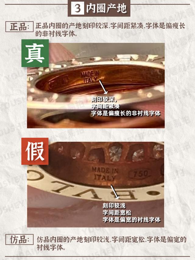 正品内圈的产地刻印较深,字间距紧凑,字体是偏瘦长的非衬线字体。仿品内圈的产地刻印较浅,字间距宽松,字体是偏宽的衬线字体。