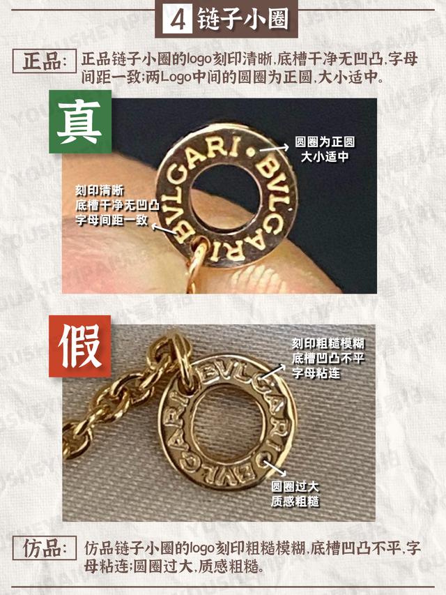 仿品链子小圈的logo刻印粗糙模糊,底槽凹凸不平,字母粘连;圆圈过大,质感粗糙。