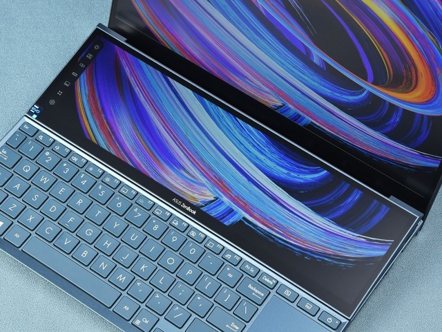下面我们来说说这两块屏幕的整体素质,首先是主屏幕采用了一块1920x1080分辨率的14英寸触控屏,拥有16:9的屏幕比例,且采用四面窄边框模式,左右边框仅有3.5mm,这里值得一提的是屏幕关键部分,下方也同样为窄边框,并没有因为要加入副屏和铰链进行缩水。关于屏幕亮度方面,主屏幕与副屏幕均为400尼特,所以在使用的过程当中,两块屏幕之间完全不会出现色差和亮度差异产生的衔接问题。此外副屏幕的尺寸为12.65吋,分辨率为1920x 515,屏幕比例为32:9并同样具备触控功能。