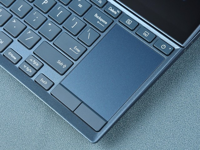C店面的触控板被设计在了最右侧,可能很多人在初期使用的时候并不习惯,为了让华硕灵耀X双屏笔记本的副屏利用率达到最大化,工程师设计了另一套解决方案,也就是使用三根手指轻敲副屏,那么副屏就能成为一个巨大的触控板,你能想象到整块副屏变成触控板时的场景么?再也不用再担心手指划出触控板之外。