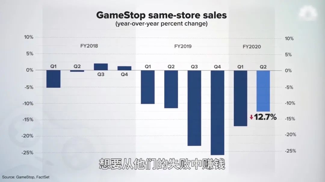 事情的起因,要从一家曾经濒临破产的公司“游戏驿站GME”开始说起。Gamestop是美国的一家线下游戏连锁店,基本全国哪儿都有,主要卖游戏光碟,就像我们小时候学校门口卖文具的,对美国宅男来说,那是情怀是他们的快乐老家。但因为互联网商业的崛起,再加上疫情影响,线下生意一年不如一年,于是这家公司被华尔街的金融机构盯上了,这些大机构打算做空GME股票,想要从他们的失败中赚钱。