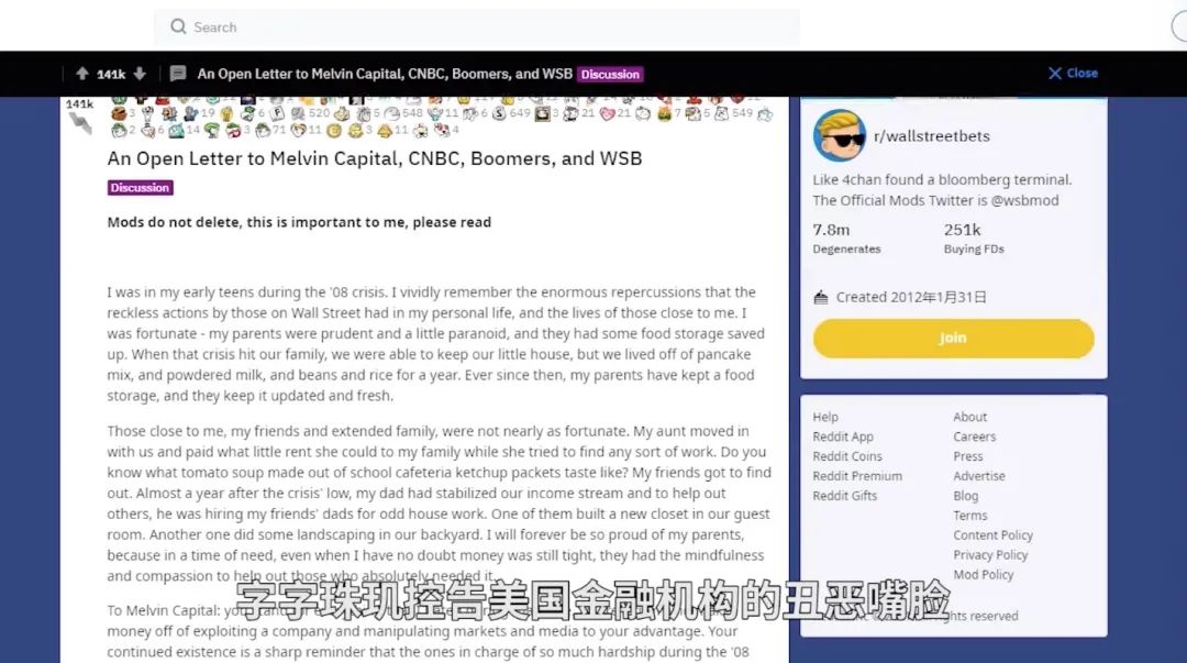 1月28日,“华尔街赌局”上一位网友写了一份“至做空机构Melvin Capital”的公开信,字字珠玑控告美国金融机构的丑恶嘴脸,指控他们间接导致了2008年的美国金融危机,给普通大众带去了苦难,这些大资本家自己却领着国家的补贴,用着纳税人的钱,拍拍屁股走人,他是这么说的: