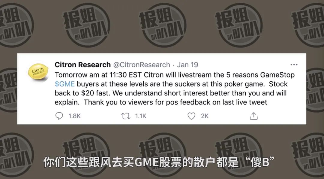 今年1月19日,参与做空的其中一家华尔街机构香橼坐不住了,他们在推特上说GME最多就值20美元一股,未来肯定要跌。你们这些跟风去买GME股票的散户都是“傻B”。