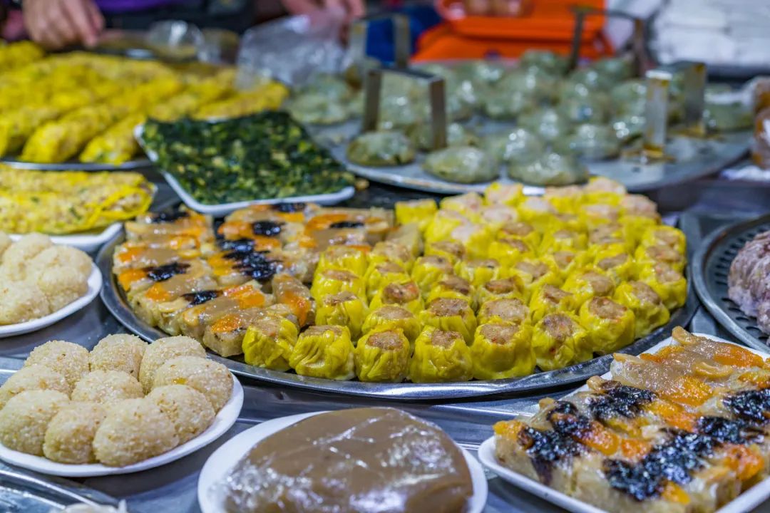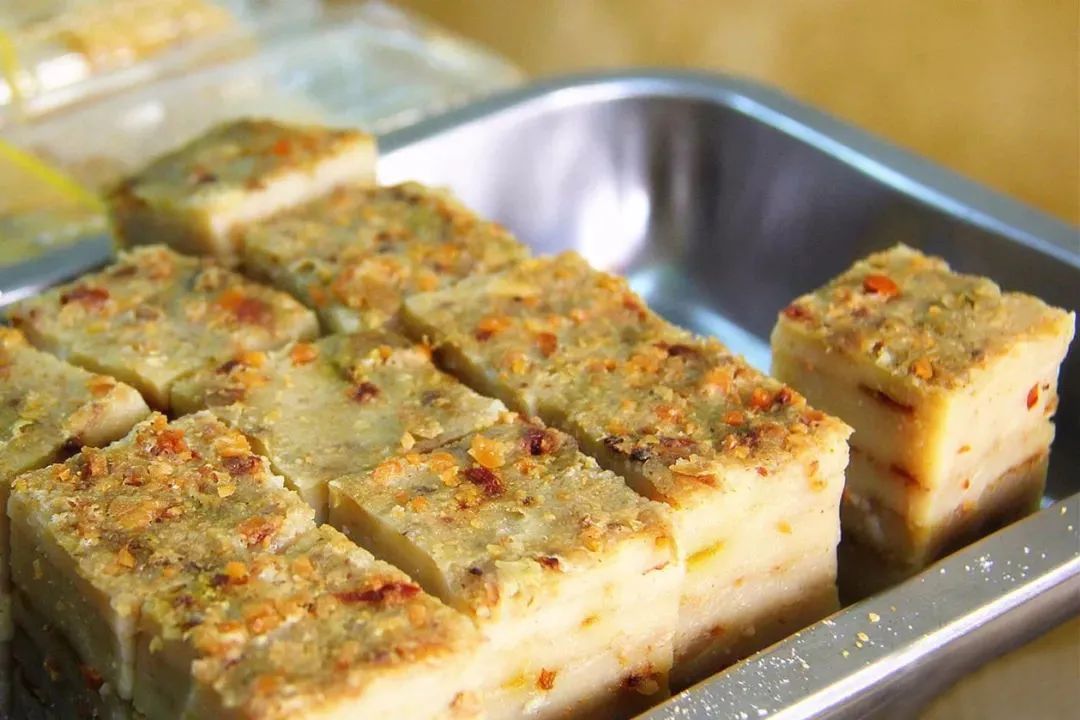 在福建闽南等地有一知名小吃叫九层粿。在米浆里加入红黄色素,以红—黄—白顺序叠加,直至九层。吃时切成菱形,侧面看颜色层次分明,食之口感滋润细腻,松软清甜。