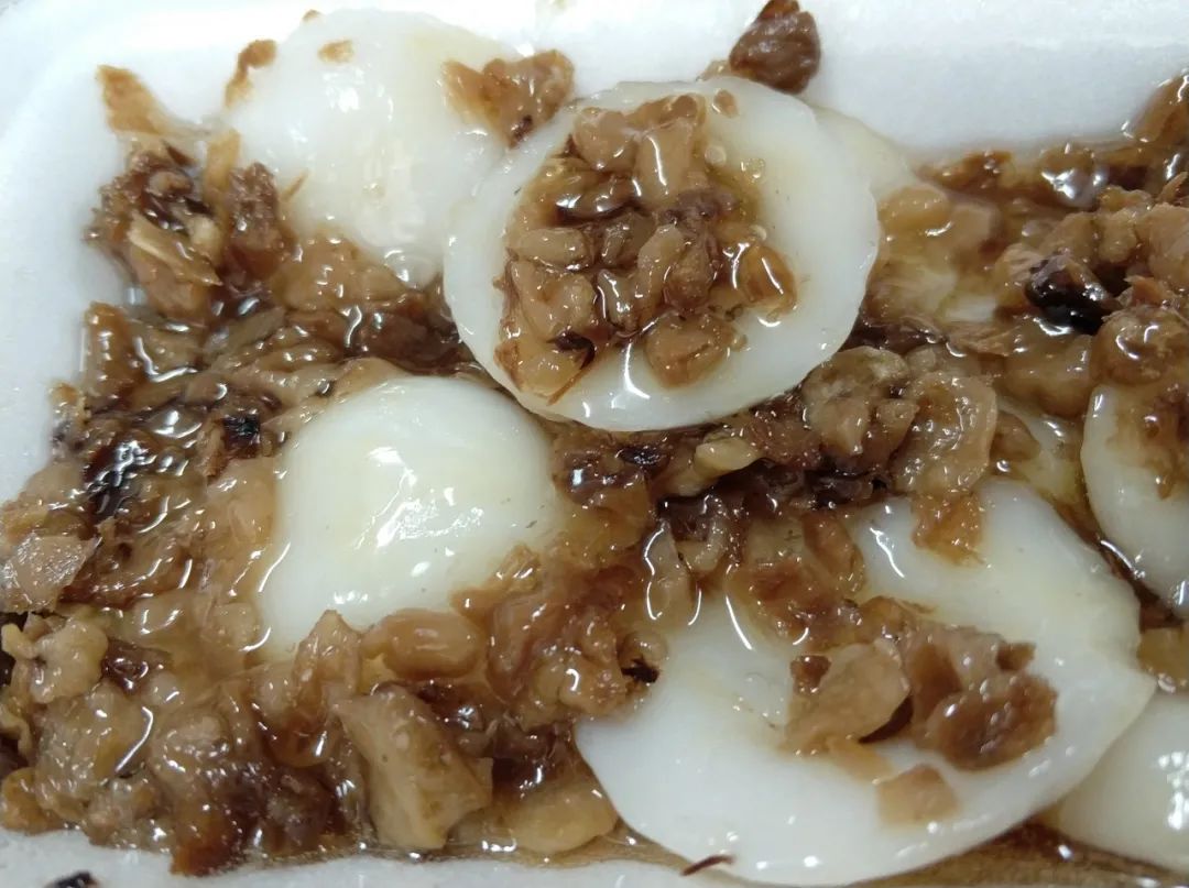 潮汕满大街的“咸水粿”,与江西灯盏粿师出同门,只是“灯盏”里的料,换成了菜脯粒,也就是萝卜干——菜脯用猪油炒熟,放一小撮在粿上,提鲜增味。