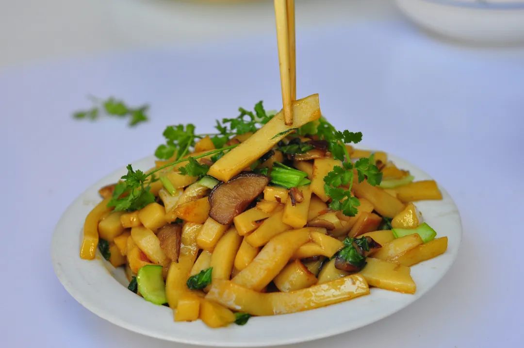 ▲ 上图:浙南山区制作“黄粿”情景,摄影/刘丽莉;下图为炒黄粿,供图/庆元县文广旅体局
