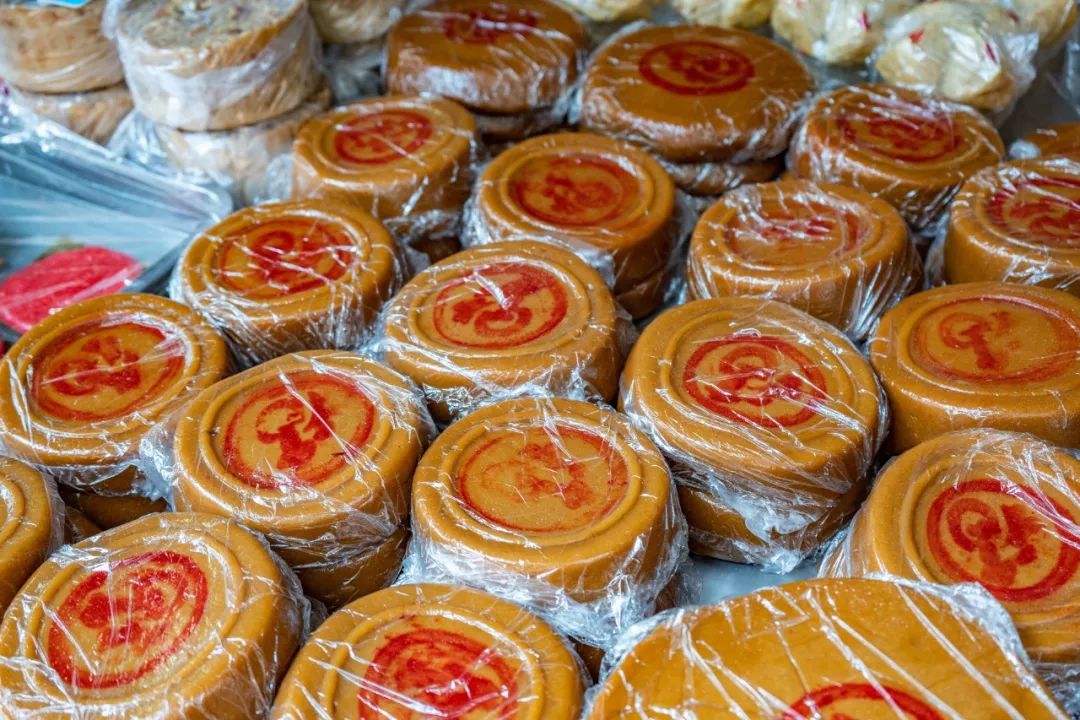 糕粿也是祭祀必备,分甜粿、发粿等几种,通常做成圆饼——早些年家家都会做,现在多向专门的粿店定制,一般单个重达十多斤。