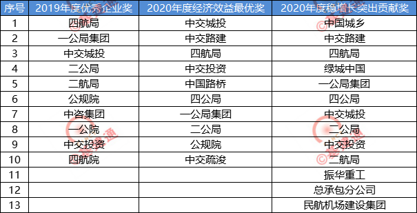 1 月 7 日,中国交建发布了其年度光荣榜,其中 3 个榜单——2019年度优秀企业奖、2020年度经济效益最优奖、2020年度稳增长突出贡献奖,就有19个单位榜上有名。