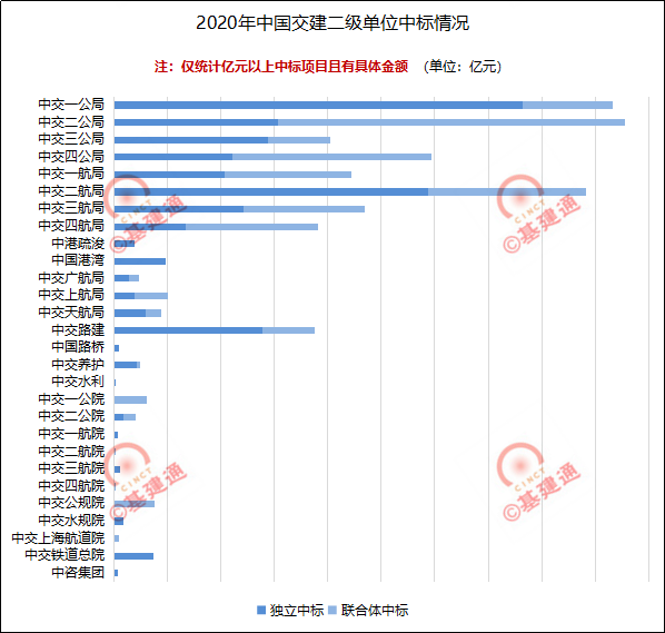 中交一公局、二公局、二航局在总的年度中标体量上,数据还是比较靠前的,尤其是中交一公局,绝大部分的业绩都是独立中标而来;中交四公局、三航局、一航局、三公局、四航局以及中交路建,也贡献了不少的订单,中国港湾、中交上航局、中交天航局等二级工程局也有项目承揽在手。